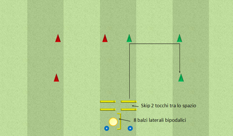 Descrizione: effettuare 8 balzi bipodalici laterali sopra un over basso, successivamente effettuare uno skip tra 2 aste e successivamente effettuare uno sprint alla massima velocità (non eccezionale nel video) seguito da 2 cambi di direzione. Effettuare prima a destra poi a sinistra