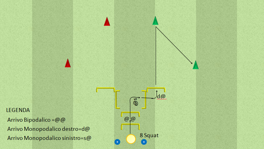 Descrizione: dopo avere effettuato 8 squat (curando la tecnica -nel video non eccezzionale-) effettuare un salto in avanti superando il primo ostacolo con arrivo in bipodalico, effettuare un secondo balzo superando il secondo ostacolo con arrivo monopodalico con corpo ruotato di 90°, successivamente superare il terzo ostacolo con arrivo monopodalico con corpo ruotato di 90°, superare il quarto ostacolo e effettuare uno sprint alla massima velocità seguito da un cambio di direzione. Effettuare prima a dx poi a sinistra sempre facendo attenzione ai giusti appoggi degli arrivi monopodalici.