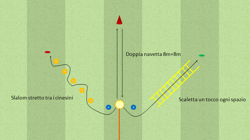 Descrizione : dopo aver effettuato la doppia navetta curando l ‘appoggio del piede di arresto nel cambio di senso( il piede deve essere orientato lateralmente per diminuire i tempi di appoggio -nel video l’esecuzione è sbagliata- ) eseguire la scaletta (un tocco ogni spazio) alla massima velocità enfatizzando l’oscillazzione degli arti superiori, ritornare in posizione di partenza. Ripetere l’esecuzione della doppia navetta e questa volta eseguire lo slalom alla massima velocità.L’esercizio è eseguito totalmente con la resistenza elastica.