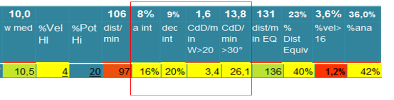 i dati evidenziati ( a int- dec int- cdd/min ) ci mostrano che l’esercitazione scelta è molto ricca di decelerazioni intense, cambi di direzione e accelerazioni intense tutti elementi che identificano un buon lavoro di forza specifica del nostro giocatore !!