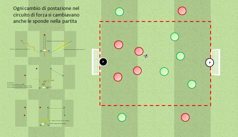 Con il mister nel frattempo gli altri 12 giocatori svolgevano un 4vs4 con 2 sponde laterali + portieri in un campo di 30×35, ogni volta che nel circuito di forza (3 minuti) i giocatori cambiavano postazione le sponde nella partita si cambiavano, dopo 9 minuti la squadra che effettuava il percorso di forza prendeva il posto di una delle due squadre che disputavano la partita a ranghi ridotti. Ogni squadra ha effettuato 9 minuti di forza nel circuito e 18 minuti di partita. Totale esercitazione di forza 27 minuti.