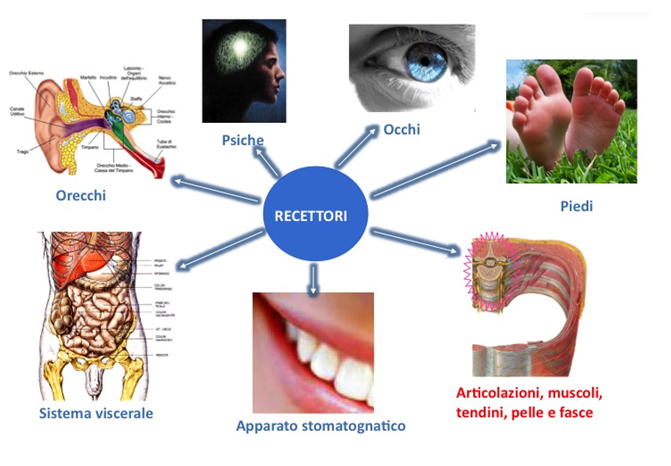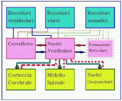 dei piedi,i propriocettori muscolari ed articolari che, sensibili alle variazioni di tensione dei muscoli ed ai cambiamenti di posizione dei segmenti articolari rivelano l’inclinazione del corpo, i recettori vestibolari che, in base ai movimenti del capo indicano l’inclinazione del corpo, ed infine le afferenze visive che trasmettono informazioni sul movimento del campo visivo.