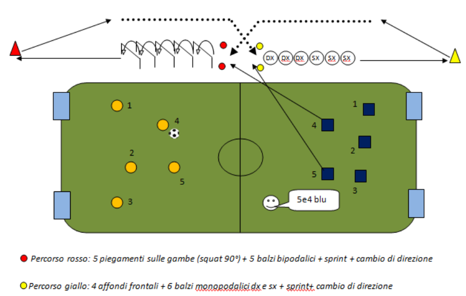Prima di iniziare la partita si assegna ai giocatori di ogni squadra un numero. In un campo di 40×30 con due porticine piccole per lato, si gioca a due tocchi e il goal deve essere effettuato di prima. Fuori dal campo si creano due postazioni di forza esplosiva/resistente seguiti da un scatto con cambio di direzione intenso. L’istruttore chiama due numeri della stessa squadra, al segnale la coppia chiamata corre verso i due percorsi (partenza delimitata da due cinesini rossi e due cinesini gialli), dopo aver terminato il primo percorso entrambi(un ragazzo il percorso rosso e l’altro il giallo ) ritornano indietro correndo lentamente (freccia tratteggiata) e effettuano il secondo percorso sempre ad alta intensità, terminati i due percorsi rientrano in campo. I giocatori in campo continuano la partita mentre la coppia esegue i percorsi di forza, giocando sempre in condizioni di inferiorità e superiorità numerica.