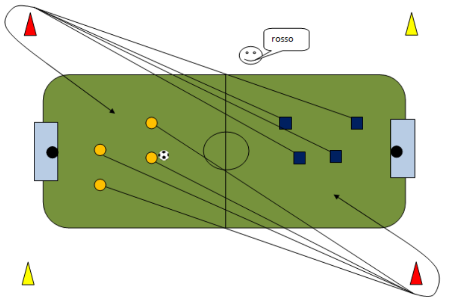 In un campo di 30×25, si gioca a tre tocchi. L’istruttore da il segnale (fischio) e chiama il colore di un cono posto fuori dal campo, al segnale le due squadre corrono verso il cono del colore chiamato ( i giocatori corrono sempre verso i coni posti dietro la porta che attaccano). Dopo aver effettuato lo scatto le due squadre ritornano in campo e continuano la partita, le due squadre si cambiano campo dopo ogni scatto.