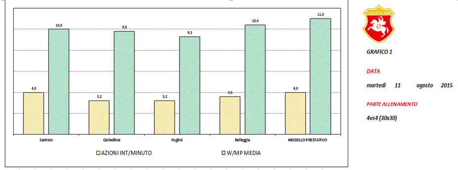 ANALISI DATI : come si può notare i dati del singolo giocatore sono stati confrontati con il modello di prestazione di una prima squadra. I dati di accelerazioni intense sono stati buoni con qualche giocatore di poco sotto la media e altri sopra la media, il valore di decelerazioni intense sono stati ottimi per l’obbiettivo che ci eravamo prefissati, infatti i valori sono alti in tutti e quattro i ragazzi, il dato dei cdd ci fà capire come questa esercitazione è ricca di movimenti specifici per il calciatore, le azioni intense al minuto dei quattro ragazzi ci confermano come questa esercitazione è stata molto densa di momenti di alta potenza, infine il valore di potenza metabolica nel secondo grafico è di poco sotto la media ma in queste esercitazioni è normale poichè la mancanza di momenti di alta velocità e l’analisi contenente recupero passivo possono portare ad un abbassamento della potenza media.