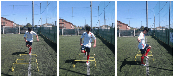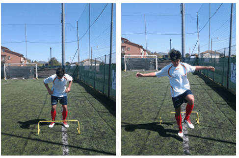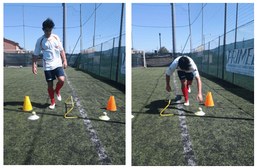 Posti davanti a 3 ostacoli, eseguire 3 balzi monopodalici con lo stesso piede, si esce dall’ultimo ostacolo con una rotazione del corpo di 90° e arrivo con il piede controlaterale in appoggio, ripetere a dx e sx